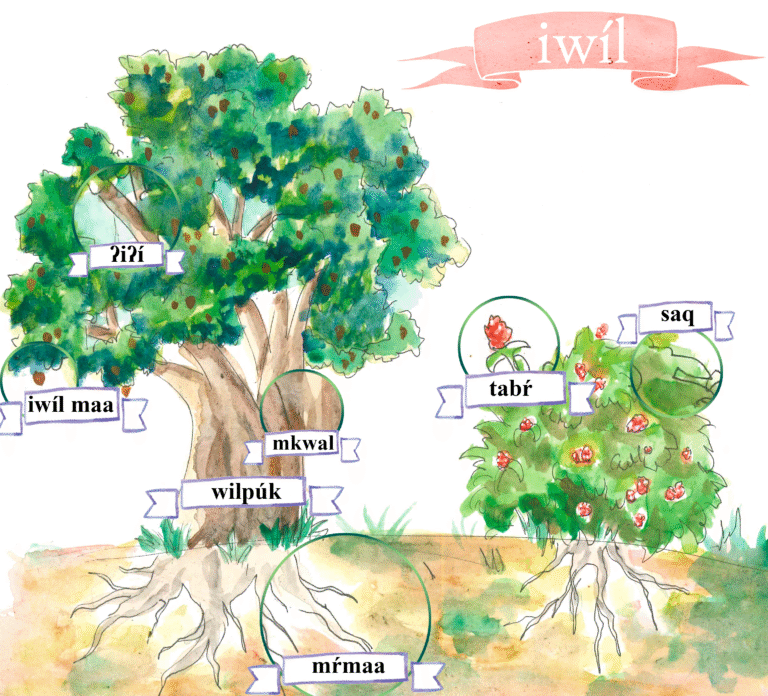 Partes de un árbol iwíl. El término también puede ser usado para un arbusto.