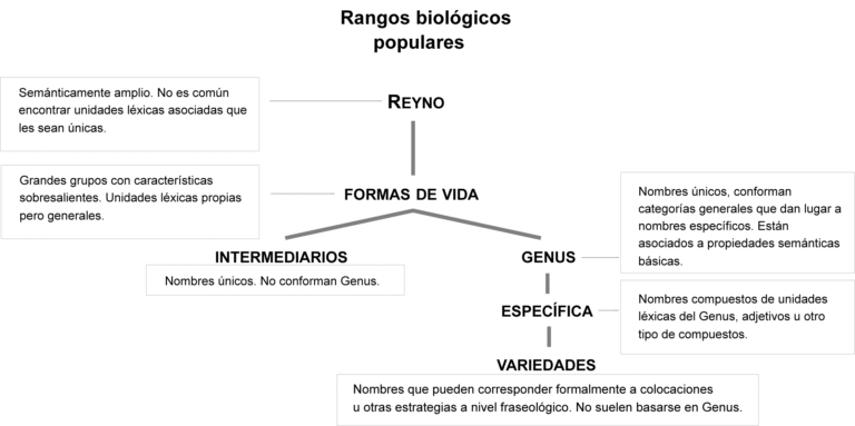 Distribución de los rangos de clasificación biológicos y su relación con unidades léxicas.